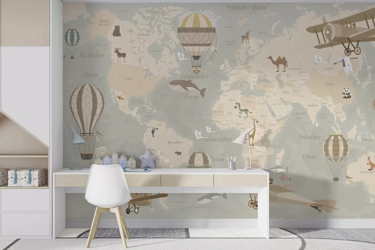 Papel tapiz Mapa mundial infantil con animales, aviones y globos aerostáticos. En alemán. Color beige. Nr. c00003de