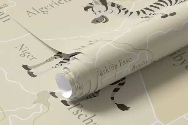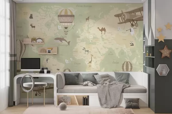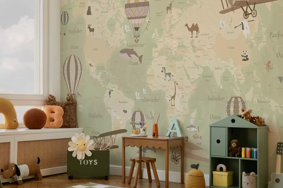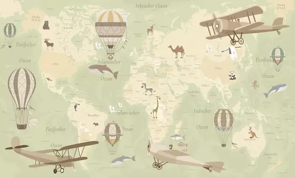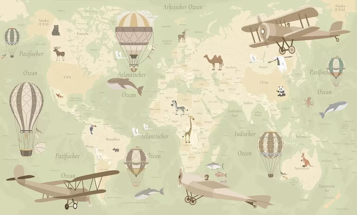 Papel tapiz Mapa mundial infantil con animales, aviones y globos aerostáticos. En alemán. Color verde. Nr. c00003dev2