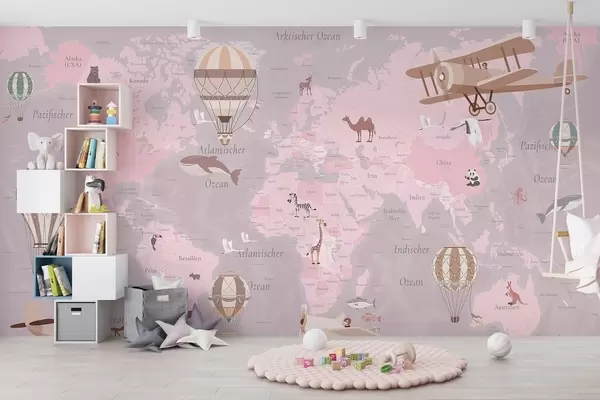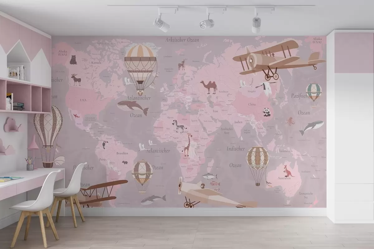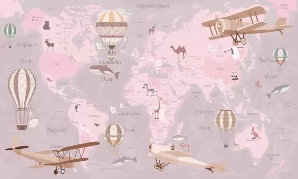 Papel tapiz Mapa mundial infantil con animales, aviones y globos aerostáticos. En alemán. Color rosa. Nr. c00003dev3