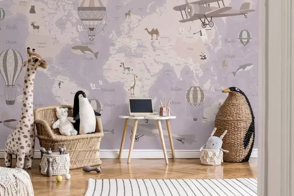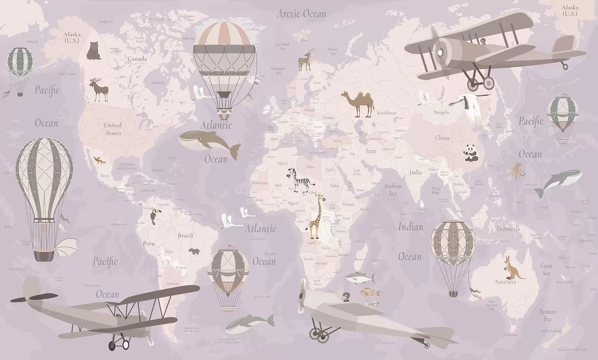 Papel tapiz Mapa mundial infantil con animales, aviones y globos aerostáticos. En inglés. Color morado. Nr. c00003env4