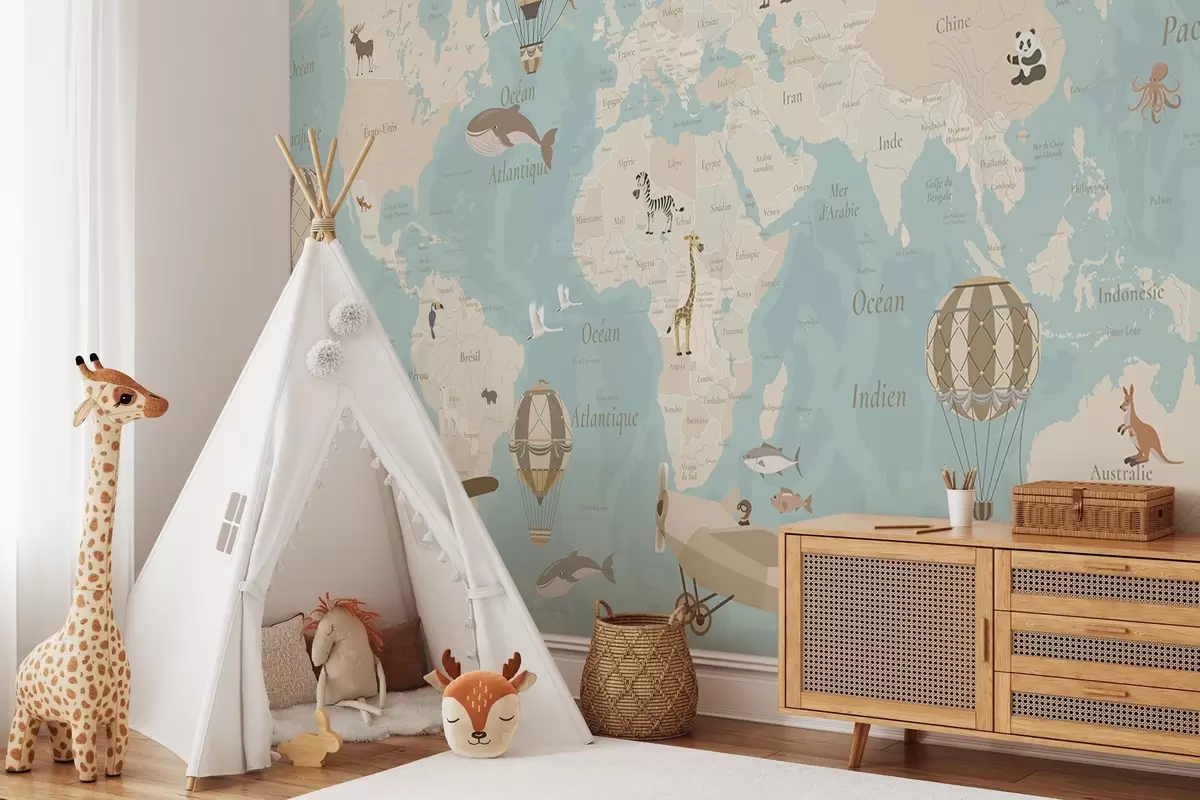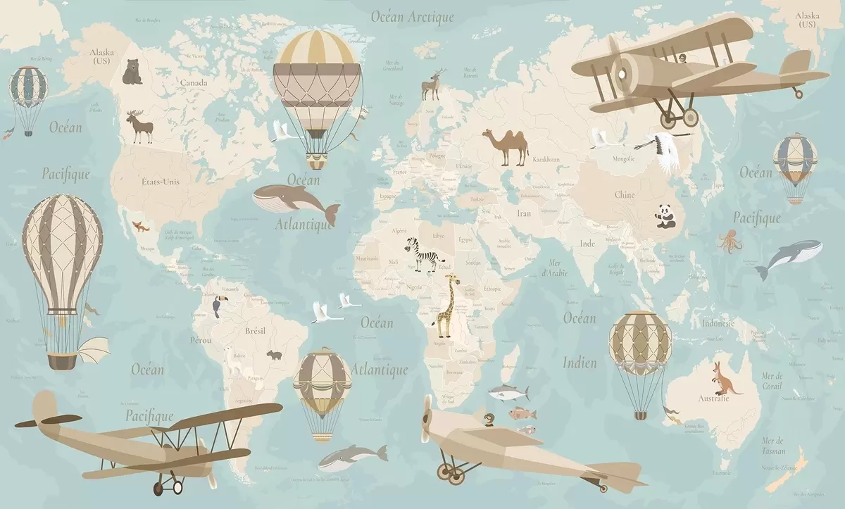 Papel tapiz Mapa mundial infantil con animales, aviones y globos aerostáticos. Idioma francés. Color azul. Nr. c00003frv1