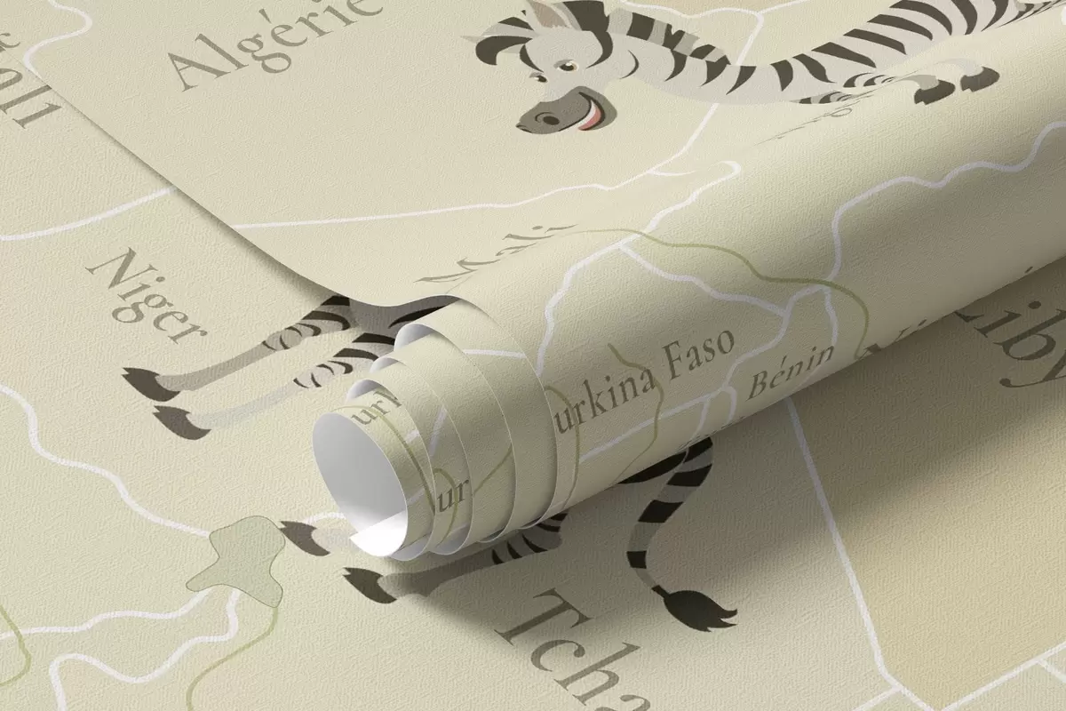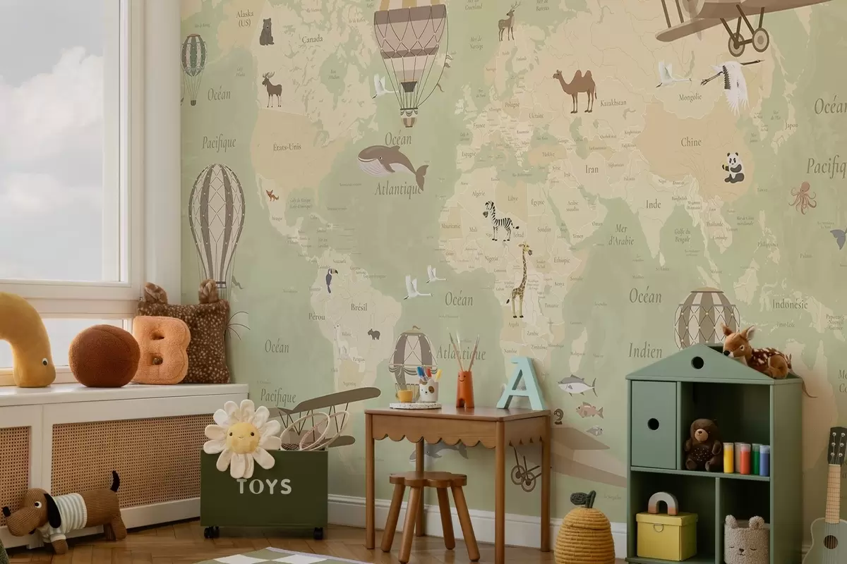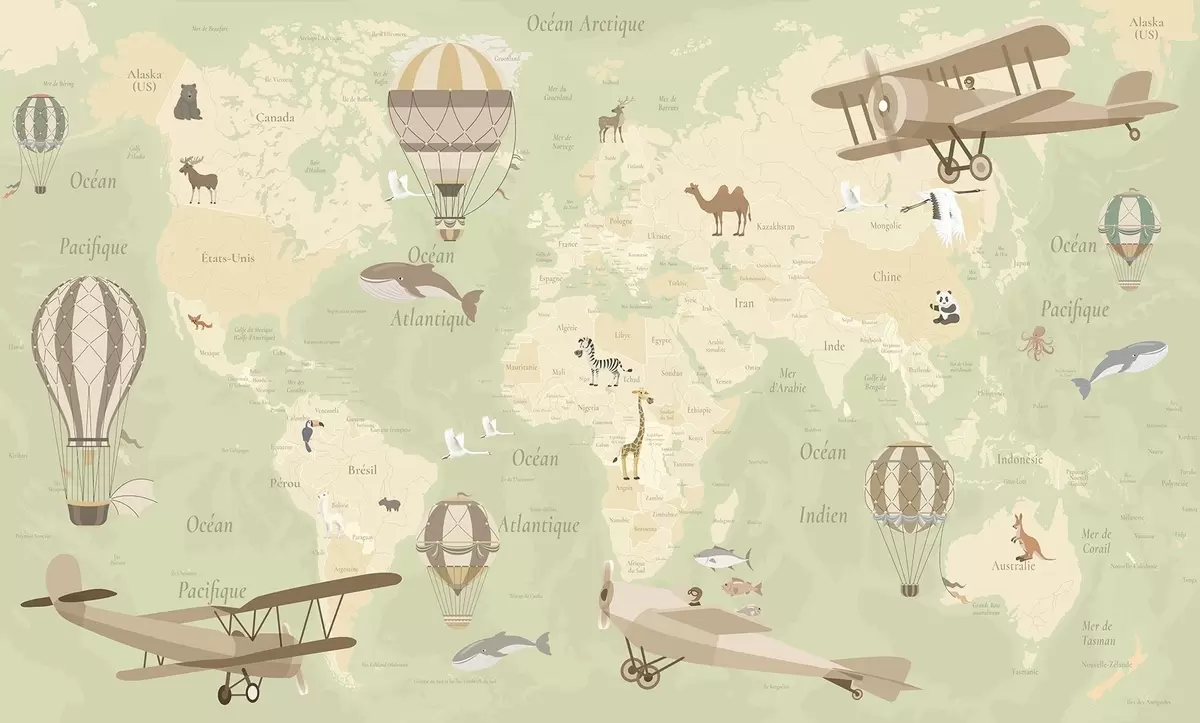 Papel tapiz Mapa mundial infantil con animales, aviones y globos aerostáticos. Idioma francés. Color verde. Nr. c00003frv2