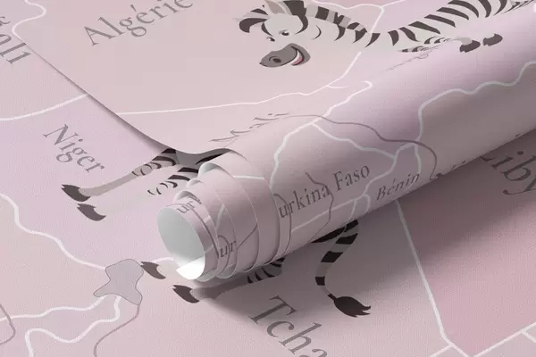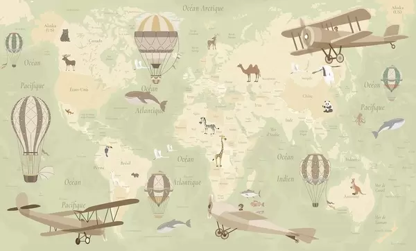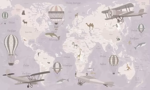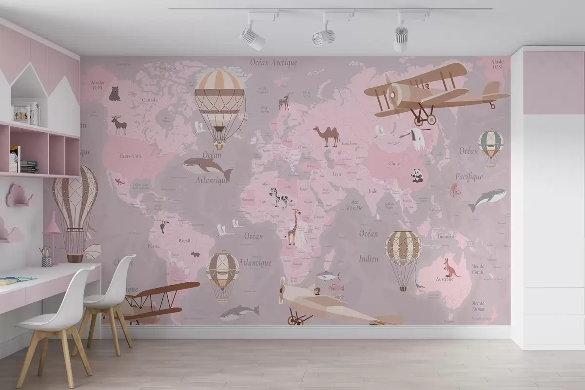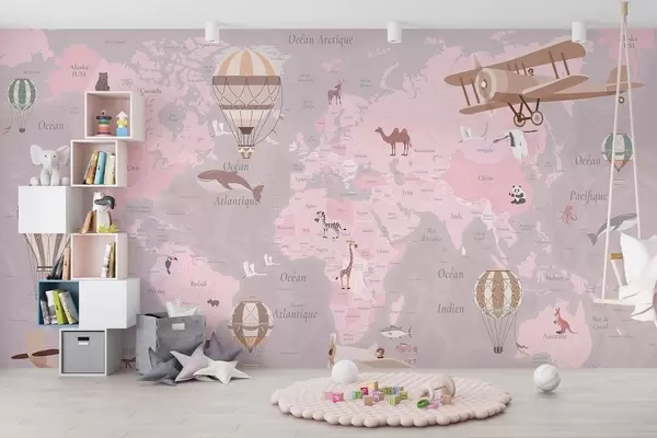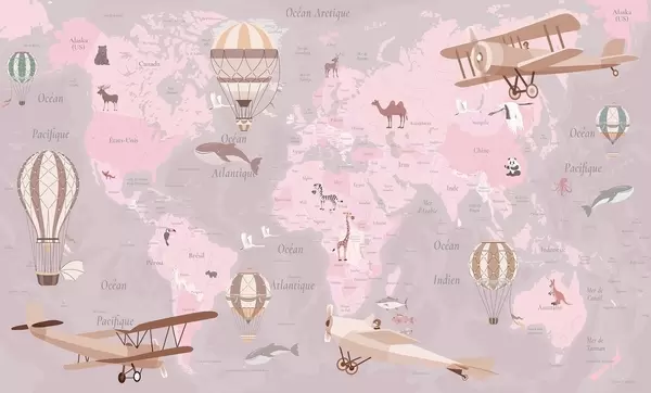 Papel tapiz Mapa mundial infantil con animales, aviones y globos aerostáticos. Idioma francés. Color rosa. Nr. c00003frv3