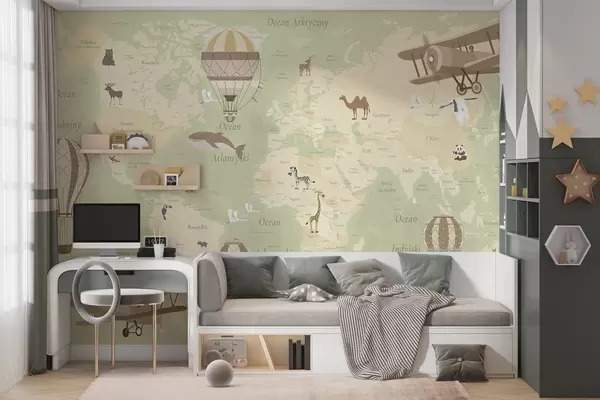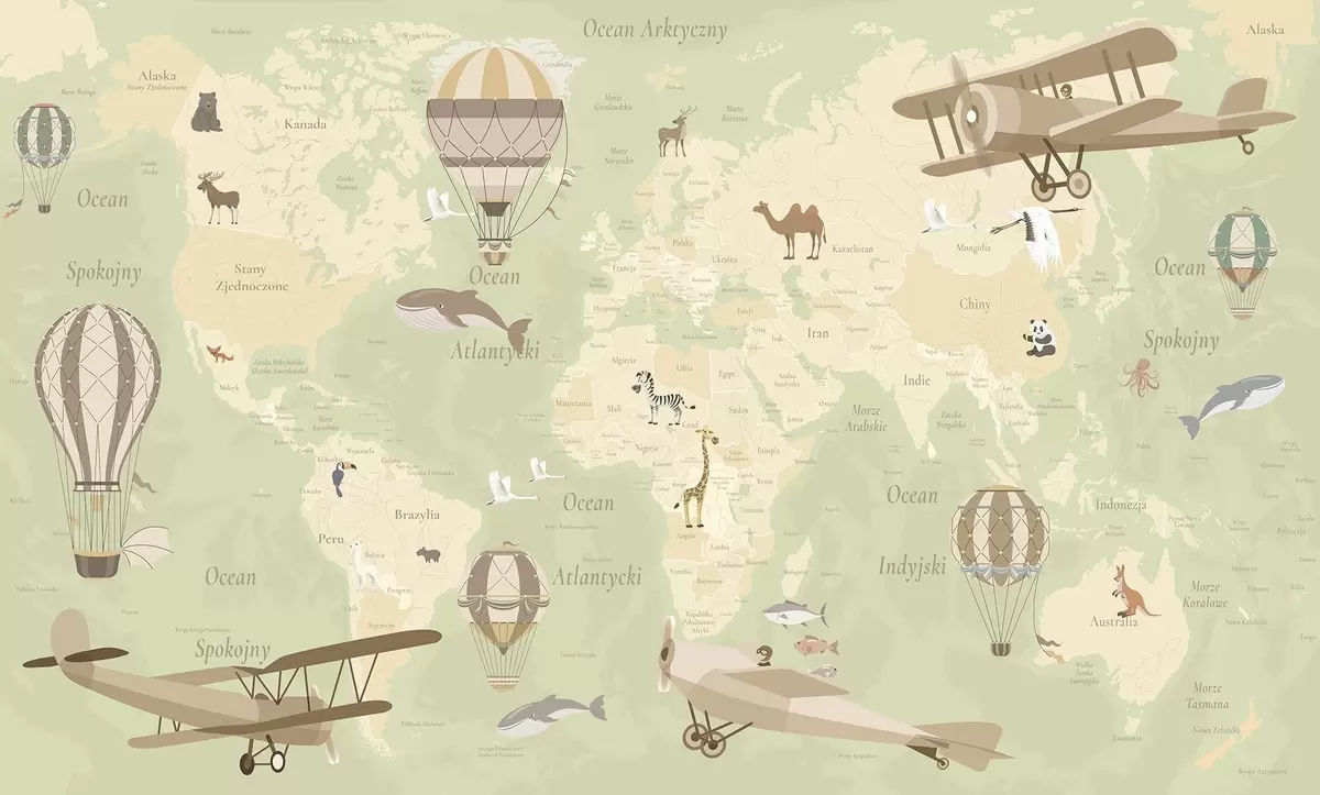 Papel tapiz Mapa mundial infantil con animales, aviones y globos aerostáticos. Idioma polaco. Color verde. Nr. c00003plv2