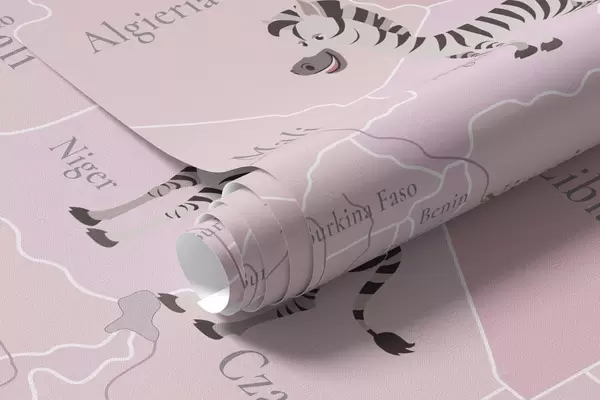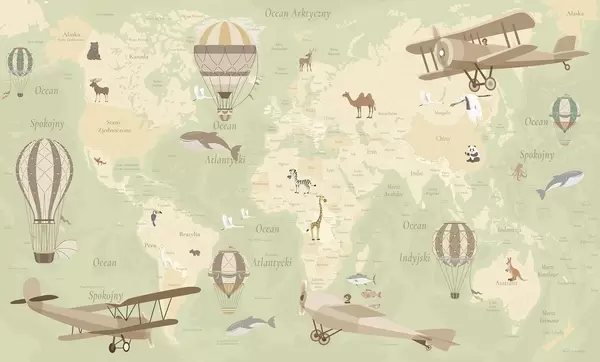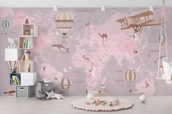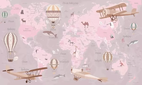 Papel tapiz Mapa mundial infantil con animales, aviones y globos aerostáticos. Idioma polaco. Color rosa. Nr. c00003plv3