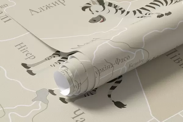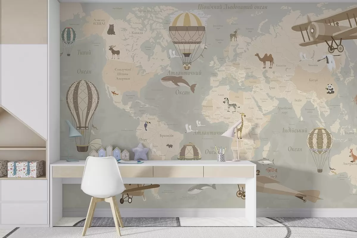 Papel tapiz Mapa mundial infantil con animales, aviones y globos aerostáticos. Idioma ucraniano. Color beige. Nr. c00003uk