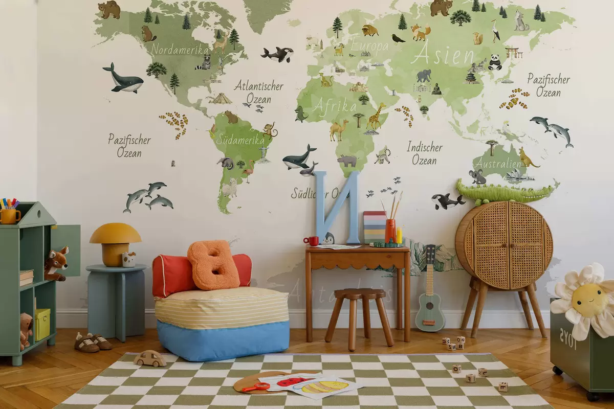 Papel tapiz Un mapa de Green en estilo acuarela con animales, plantas y arquitectura. Etiquetas en alemán Nr. c00009dev2