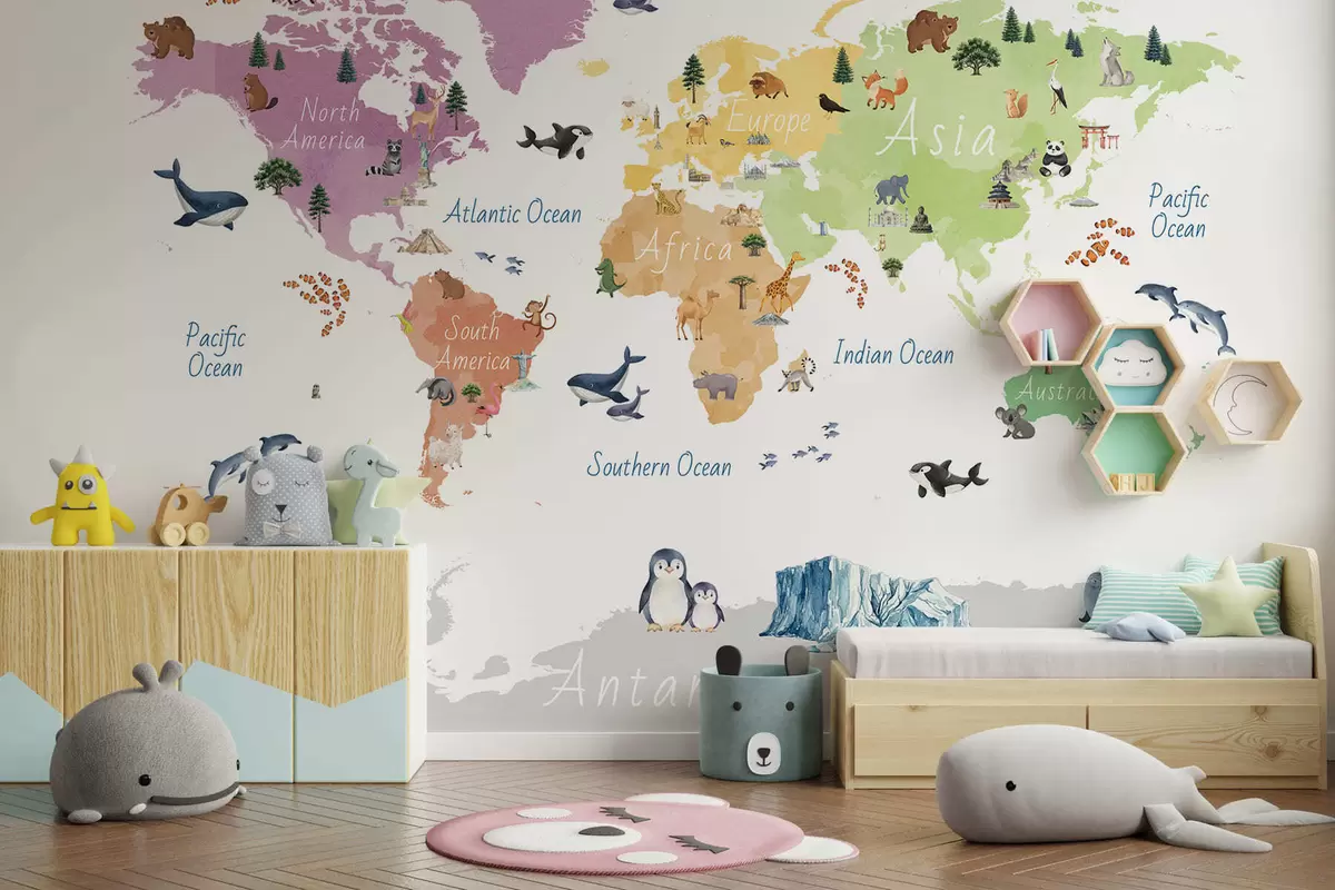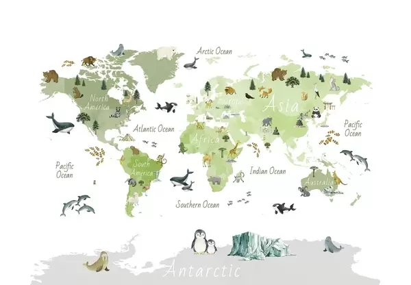 Papel tapiz Un mapa a color con estilo de acuarela en el que aparecen animales, plantas y elementos arquitectónicos. Etiquetas en inglés Nr. c00009en