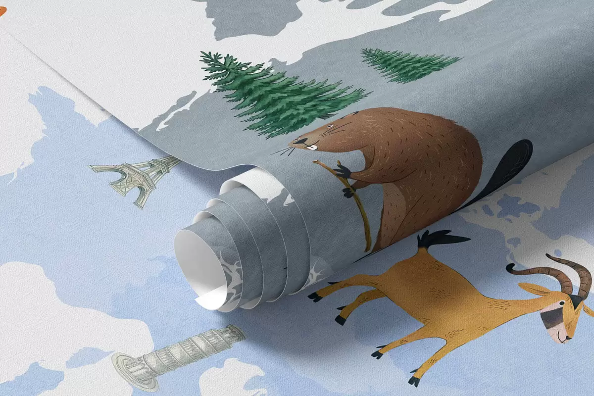 Papel tapiz Un mapa azul de estilo acuarela en el que aparecen animales, plantas y elementos arquitectónicos. Etiquetas en inglés Nr. c00009env1
