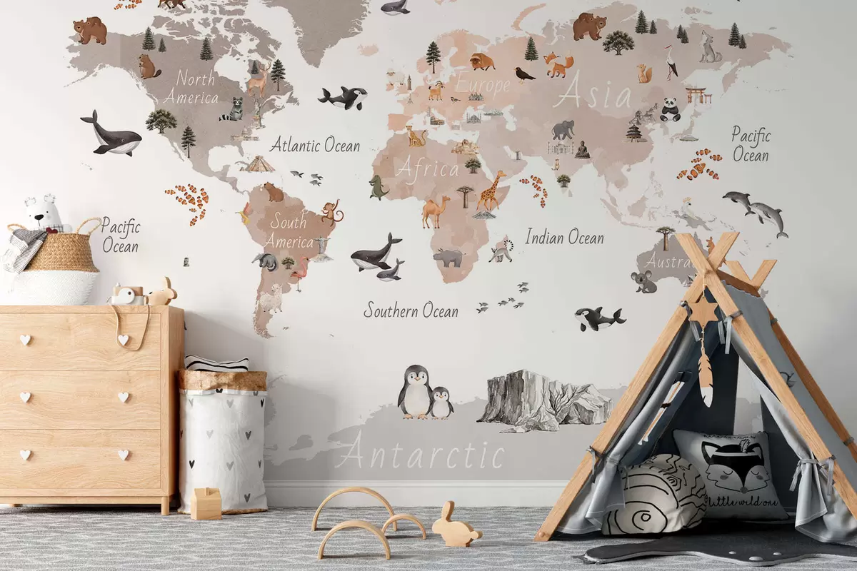 Papel tapiz Un mapa en tonos beige, con un estilo de acuarela, en el que aparecen animales, plantas y elementos arquitectónicos. Etiquetas en inglés Nr. c00009env3