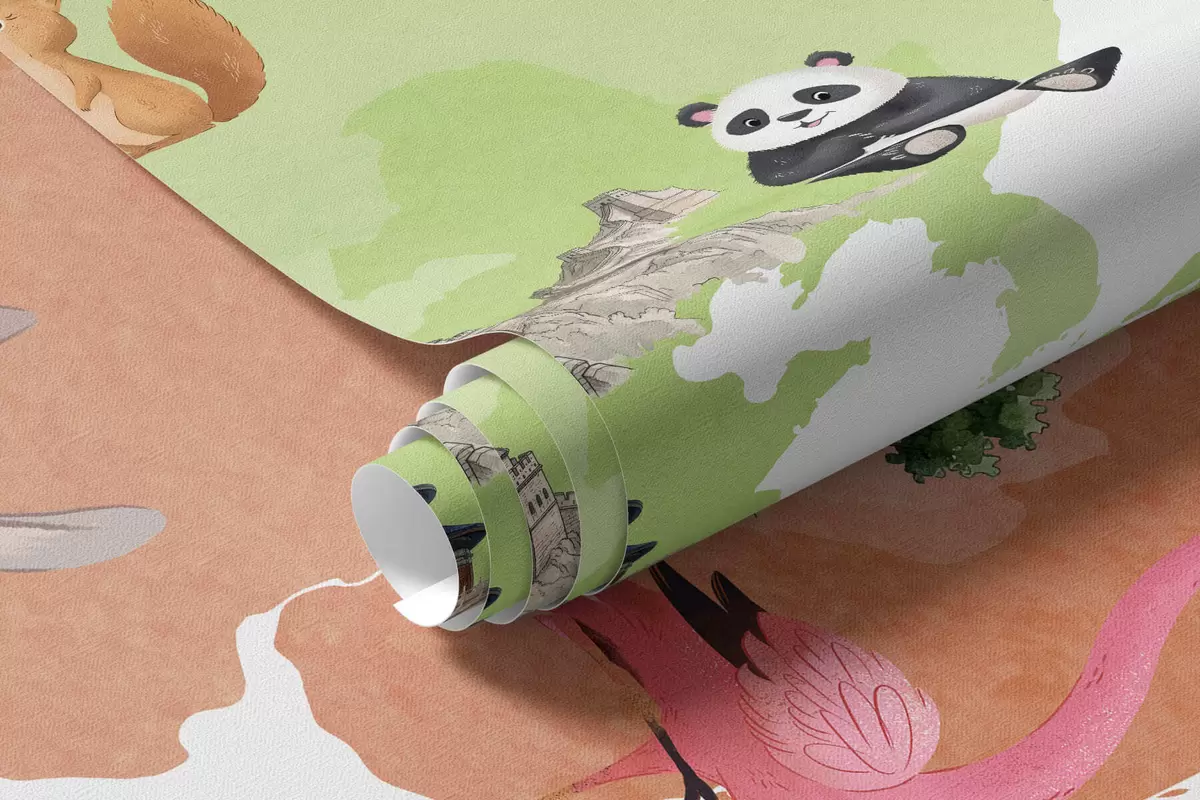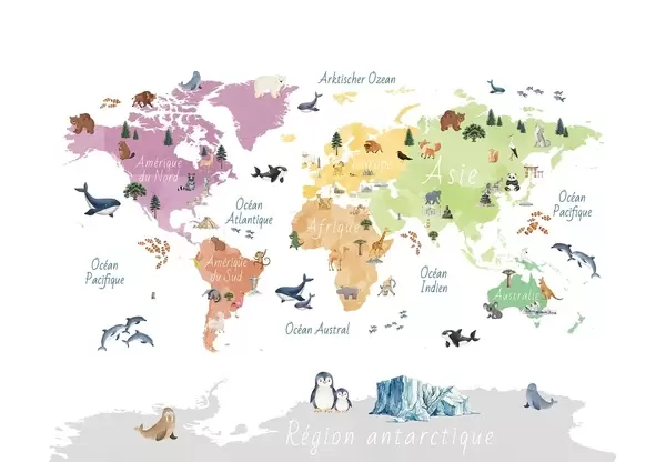Papel tapiz Un mapa a color con estilo de acuarela en el que aparecen animales, plantas y elementos arquitectónicos. Etiquetas en francés Nr. c00009fr