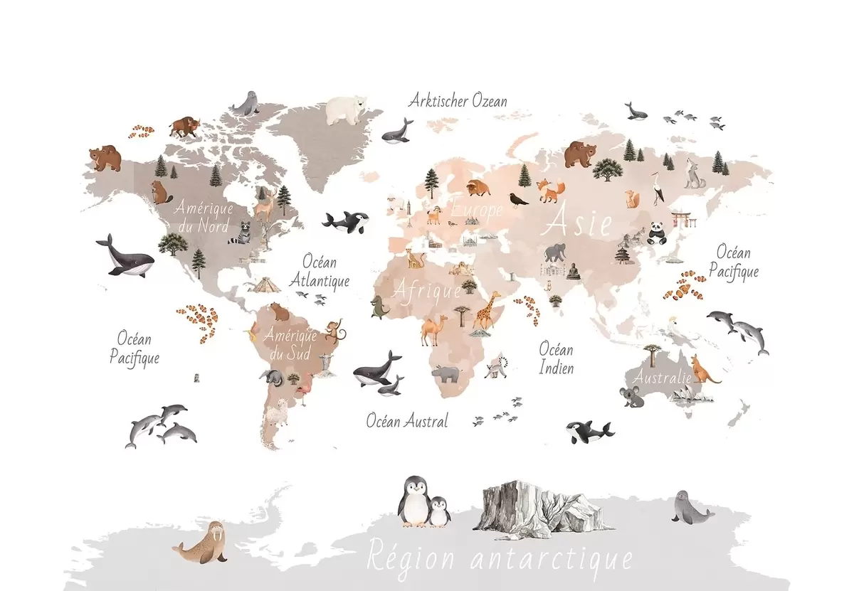 Papel tapiz Un mapa en tonos beige, con un estilo de acuarela, en el que aparecen animales, plantas y elementos arquitectónicos. Rótulos en francés Nr. c00009frv3