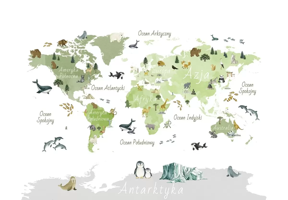Papel tapiz Un mapa de Green en estilo acuarela con animales, plantas y arquitectura. Etiquetas en polaco Nr. c00009plv2