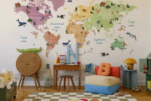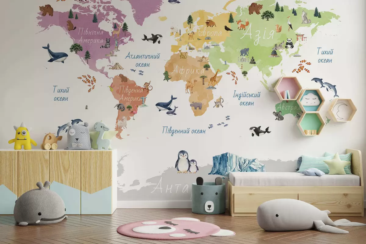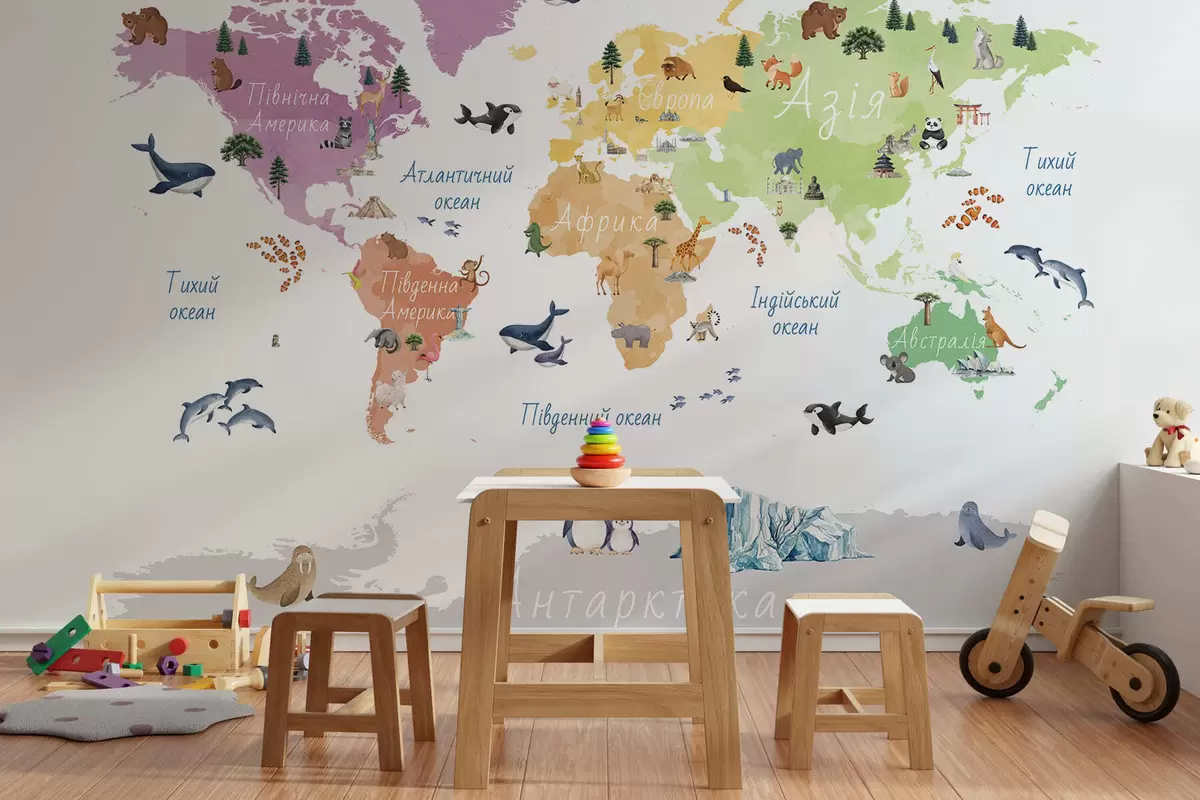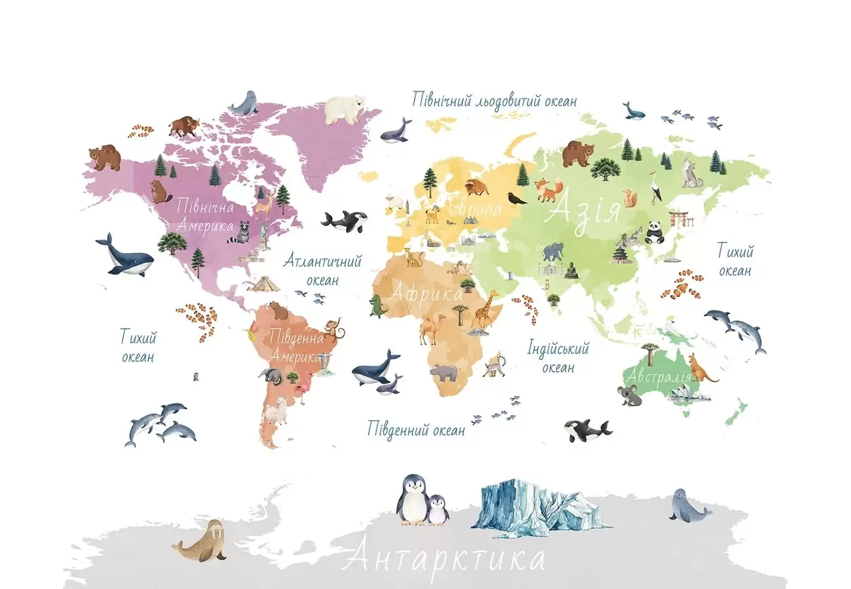 Papel tapiz Un mapa a color con estilo de acuarela en el que aparecen animales, plantas y elementos arquitectónicos. Etiquetas en ucraniano Nr. c00009uk