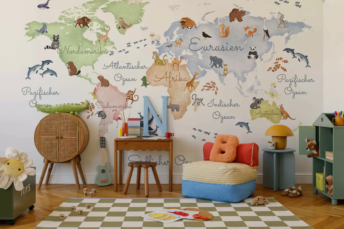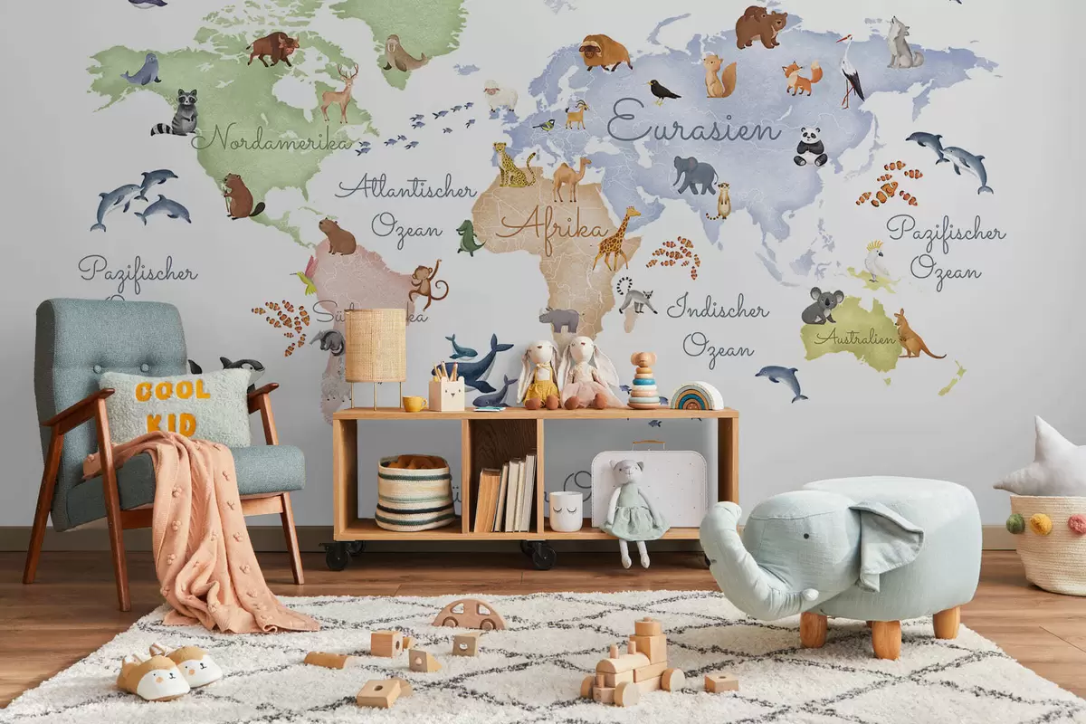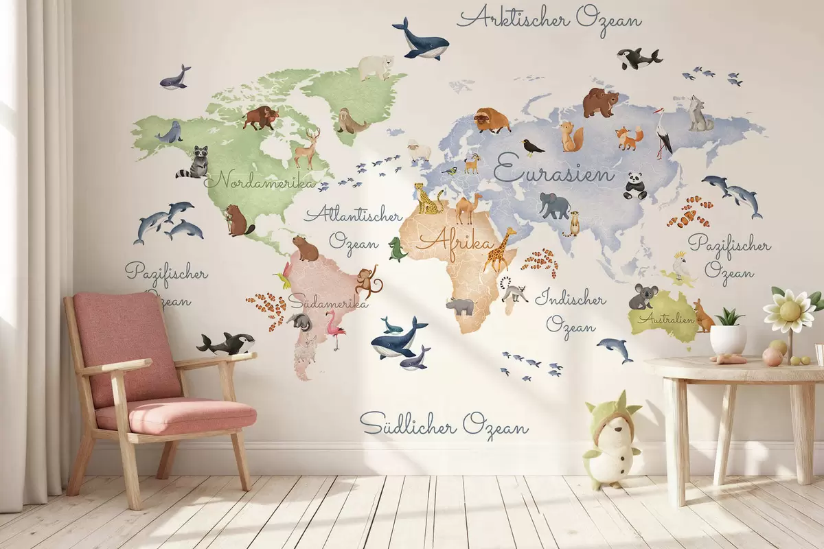 Papel tapiz Un mapa de White en estilo acuarela con animales. Etiquetas en alemán Nr. c00012de