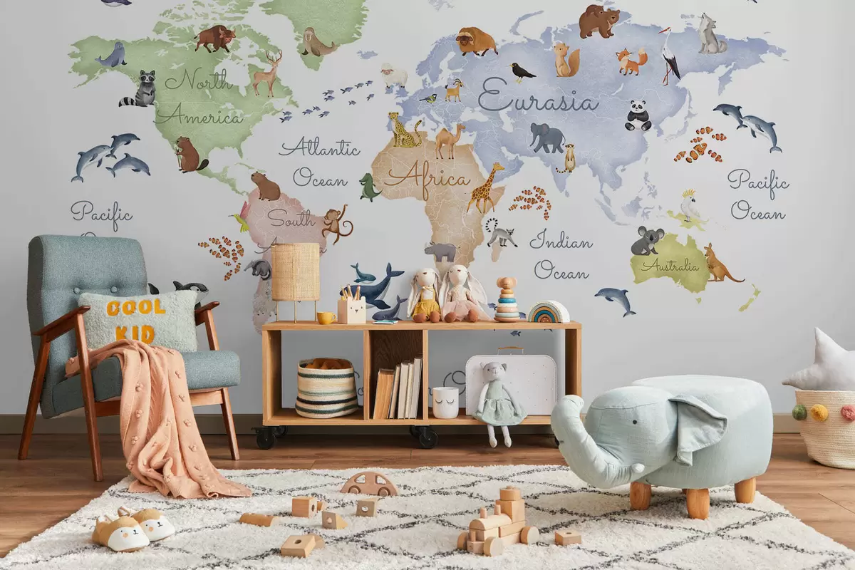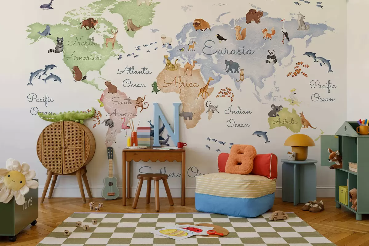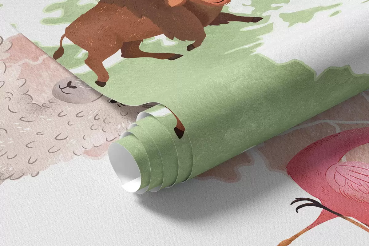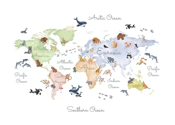 Papel tapiz Un mapa a color con estilo de acuarela en el que aparecen animales. Etiquetas en inglés Nr. c00012en