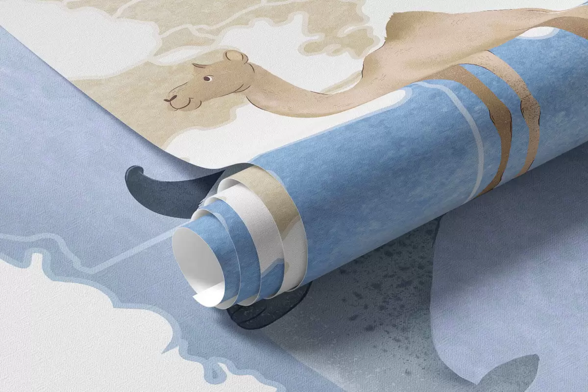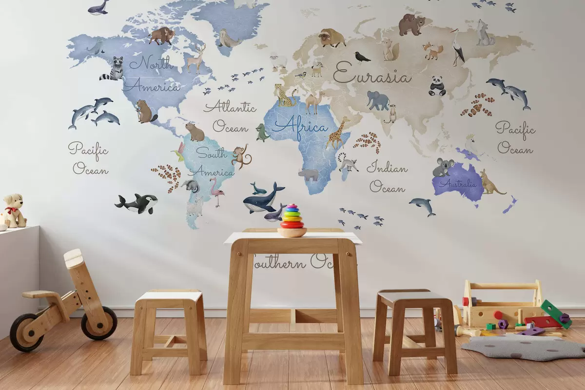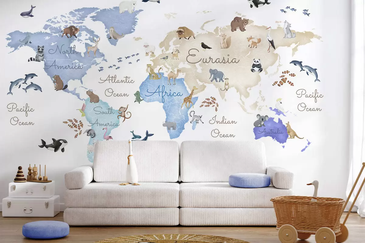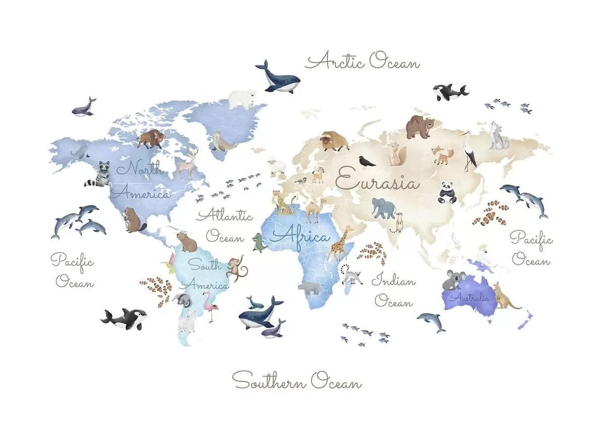 Papel tapiz Un mapa azul con estilo de acuarela en el que aparecen animales. Etiquetas en inglés Nr. c00012env1