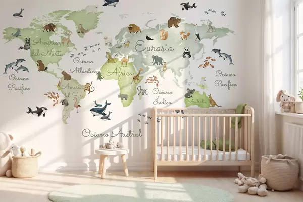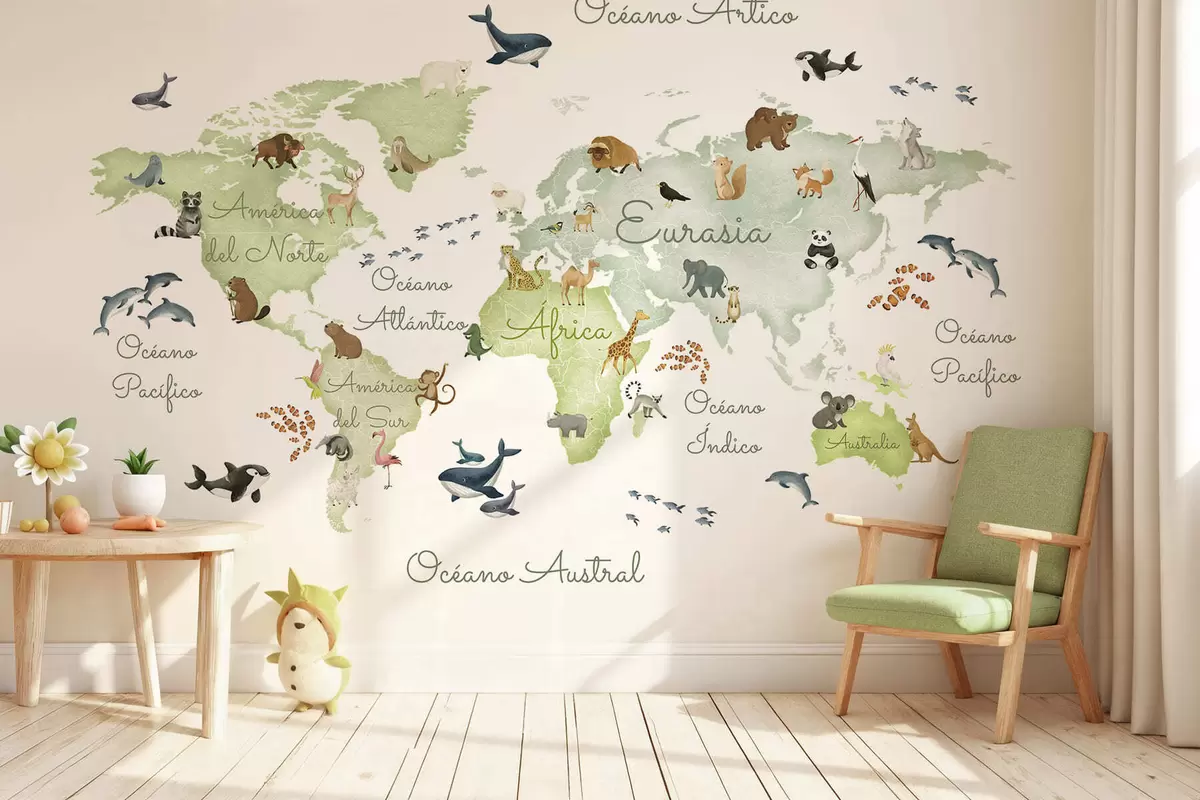 Papel tapiz Un mapa verde con estilo de acuarela en el que aparecen animales. Etiquetas en español Nr. c00012esv2