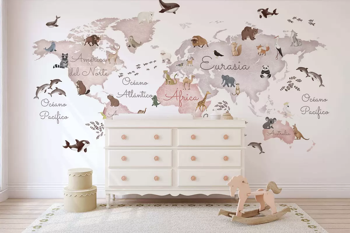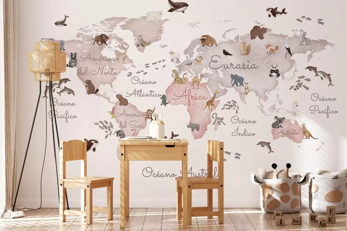 Papel tapiz Un mapa en tonos beige, con un estilo de acuarela, en el que aparecen animales. Rótulos en español Nr. c00012esv3