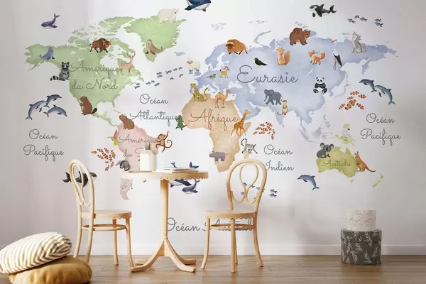 Papel tapiz Un mapa a color con estilo de acuarela en el que aparecen animales. Etiquetas en francés Nr. c00012fr