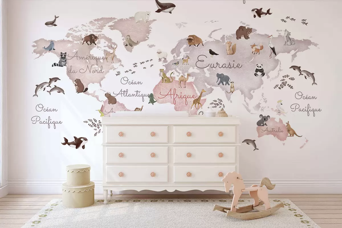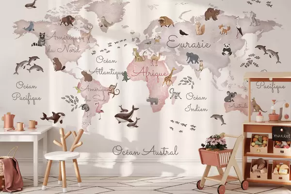 Papel tapiz Un mapa en tonos beige, con un estilo de acuarela, en el que aparecen animales. Rótulos en francés Nr. c00012frv3