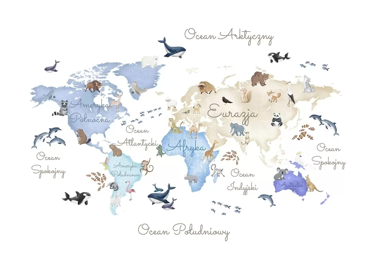 Papel tapiz Un mapa azul con estilo de acuarela en el que aparecen animales. Etiquetas en polaco Nr. c00012plv1