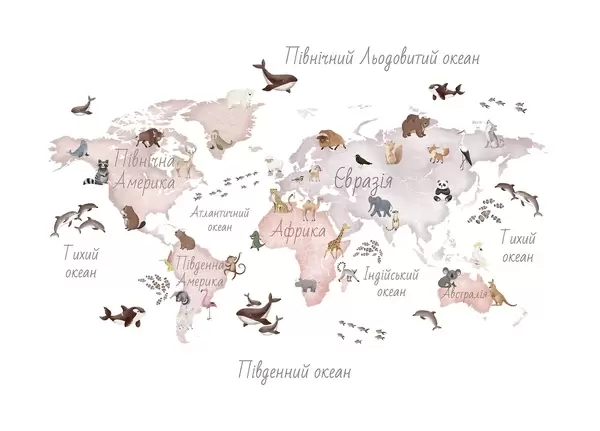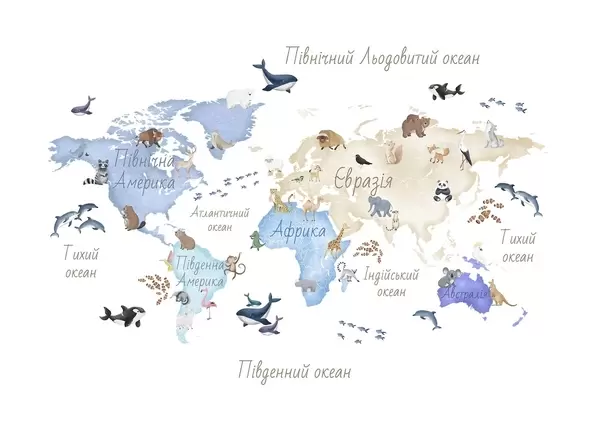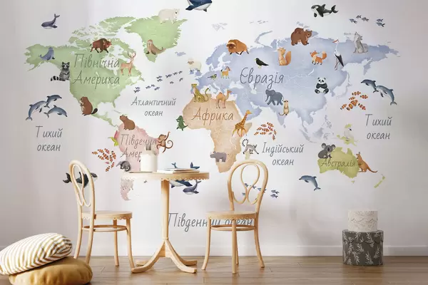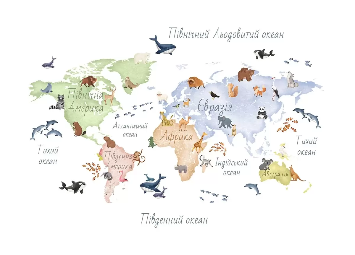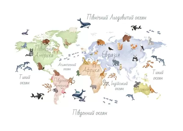 Papel tapiz Un mapa a color con estilo de acuarela en el que aparecen animales. Etiquetas en ucraniano Nr. c00012uk