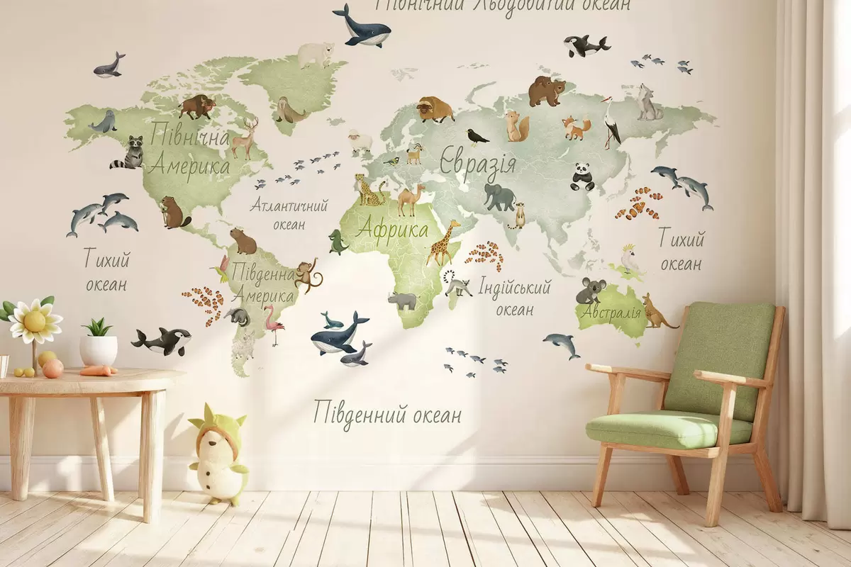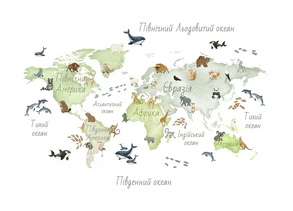 Papel tapiz Un mapa verde con estilo de acuarela en el que aparecen animales. Etiquetas en ucraniano Nr. c00012ukv2