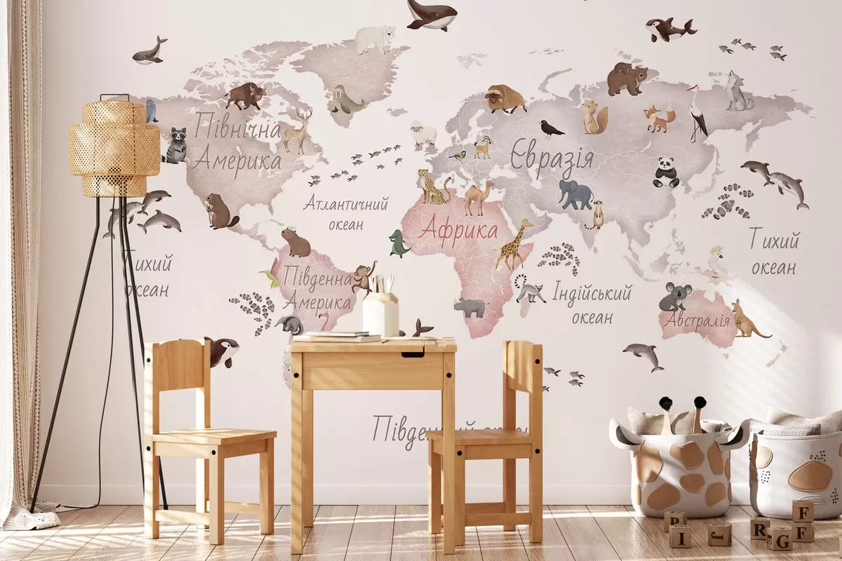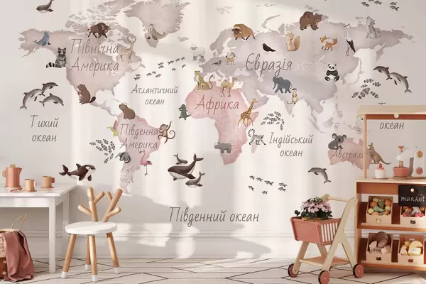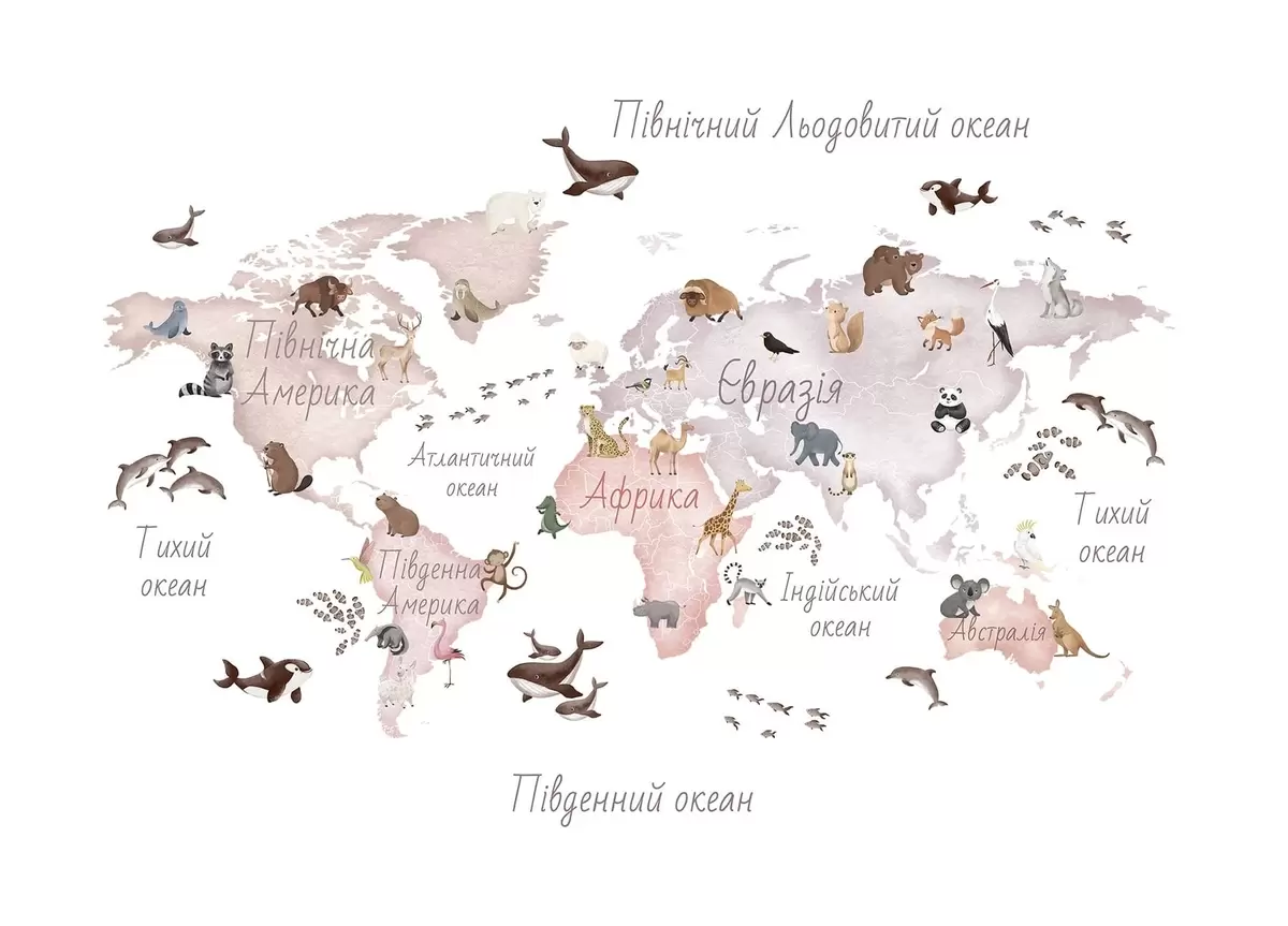 Papel tapiz Un mapa en tonos beige, con un estilo de acuarela, en el que aparecen animales. Rótulos en ucraniano Nr. c00012ukv3