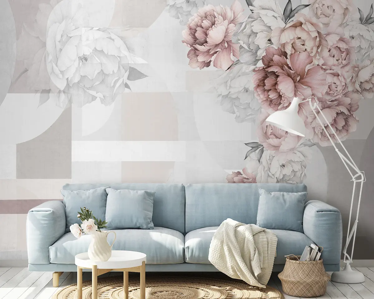 Papel tapiz Peonías de acuarela en color rosa con fondo geométrico Nr. u95855