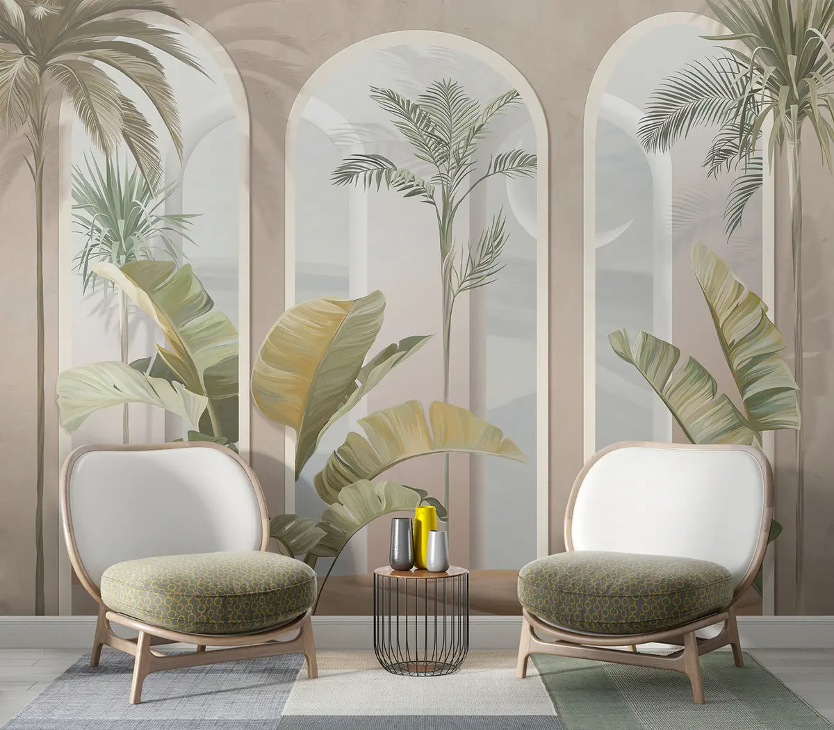 Papel tapiz Hojas tropicales 3D con palmeras y columnas. Nr. u96402