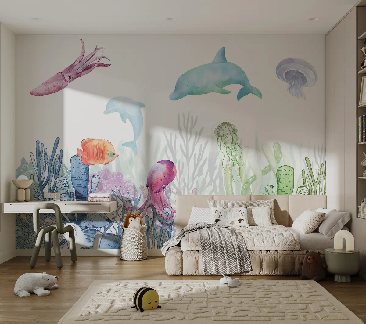 Papel tapiz Vida marina submarina, Animales marinos, Acuarela, Corales, Delfín, Pulpo Nr. u98899