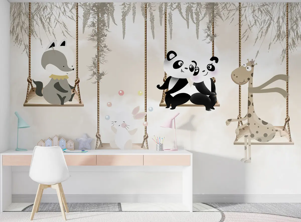 Papel tapiz Diseño de papel pintado para habitación infantil con jirafa, mapache, liebre y pandas en los columpios Nr. u98972