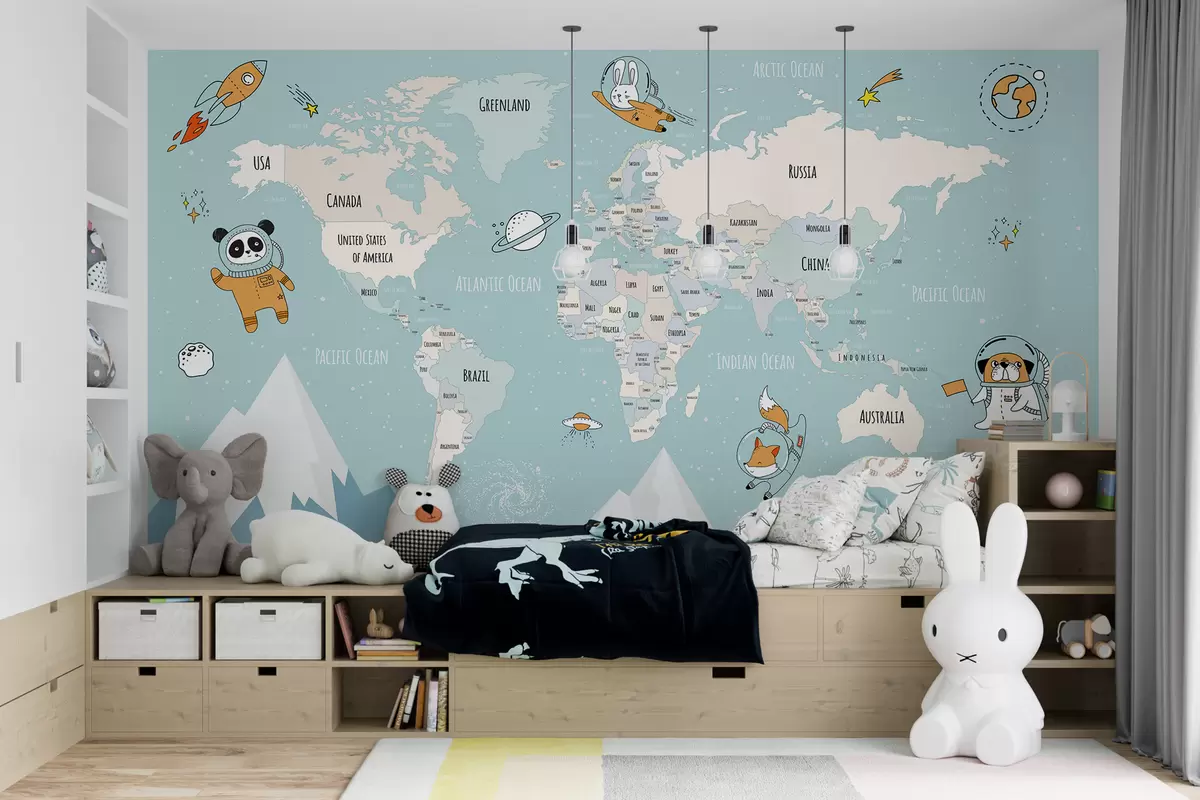 Papel tapiz Mapa de países del mundo con animales astronautas. Nr. w00066