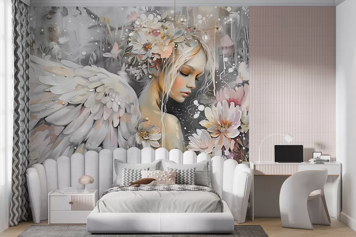 Papel tapiz Niña ángel sobre un fondo gris pintado al óleo Nr. w00761