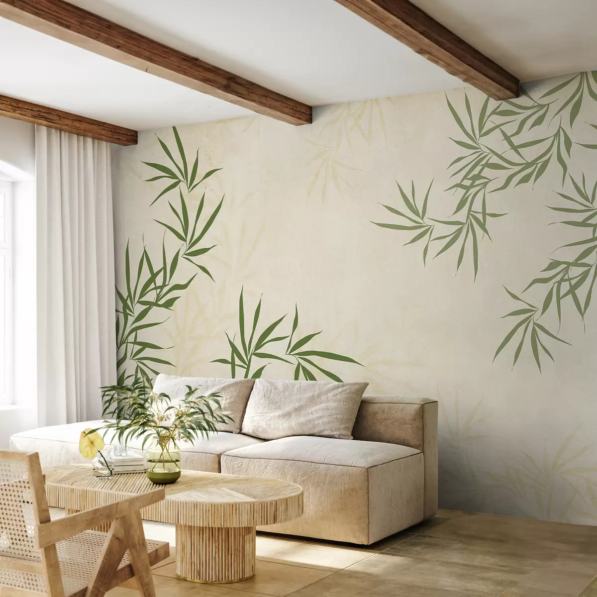 Papel tapiz Ramitas de plantas, bambú, estilo vintage, textura de fondo, color amarillo, verde Nr. w00817