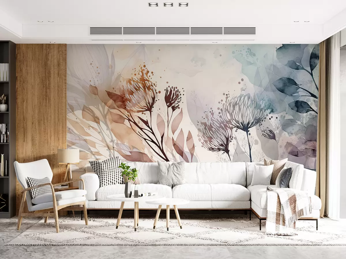 Papel tapiz Delicados elementos florales abstractos, flores estilizadas y formas vegetales en tonos apagados y terrosos, arte acuarela Nr. w00898