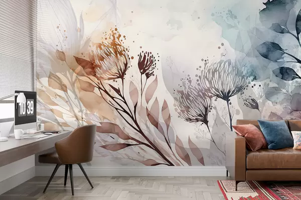 Papel tapiz Delicados elementos florales abstractos, flores estilizadas y formas vegetales en tonos apagados y terrosos, arte acuarela Nr. w00898
