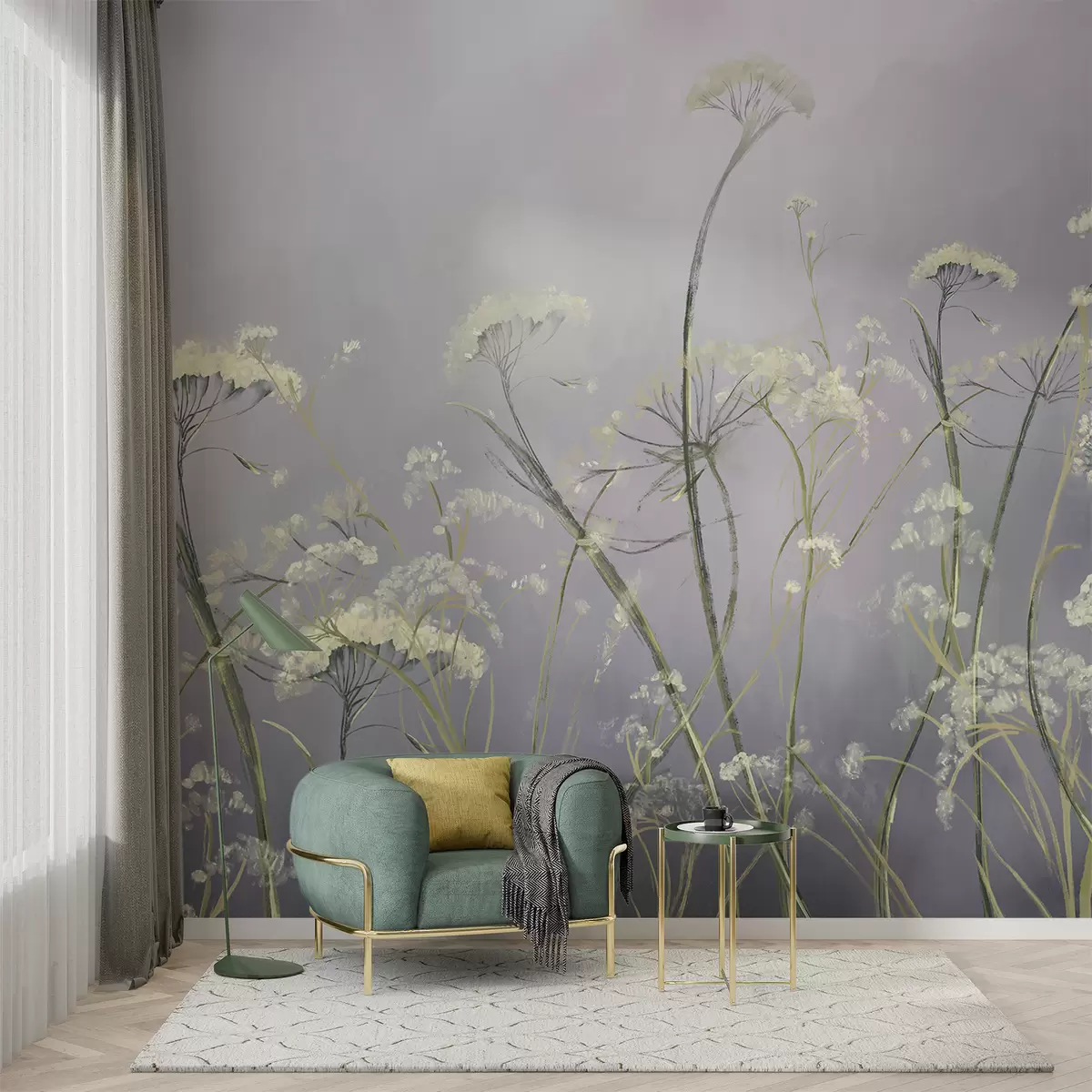 Papel tapiz Flores silvestres blancas en un campo brumoso con un fondo gris suave y borroso Nr. w00903