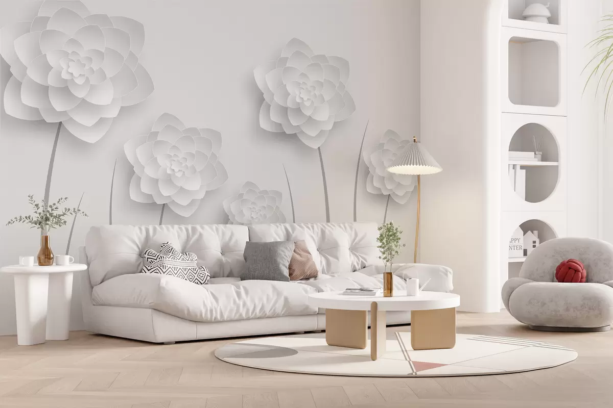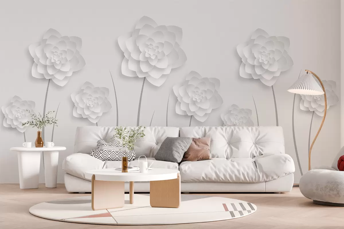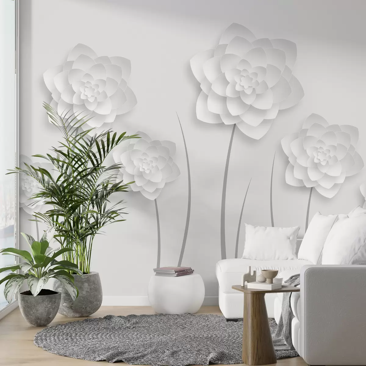 murales de pared Flores grandes con imitación de volumen en estilo papel sobre fondo gris claro con tallo gris w01021