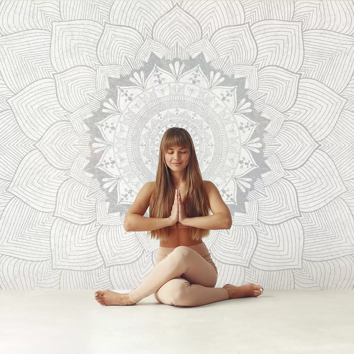 Papel tapiz Mandala redondo, papel pintado para espacio de yoga o para armonizar el espacio personal. Mandala mural en tonos grises sobre fondo heterogéneo texturado Nr. w01088v2
