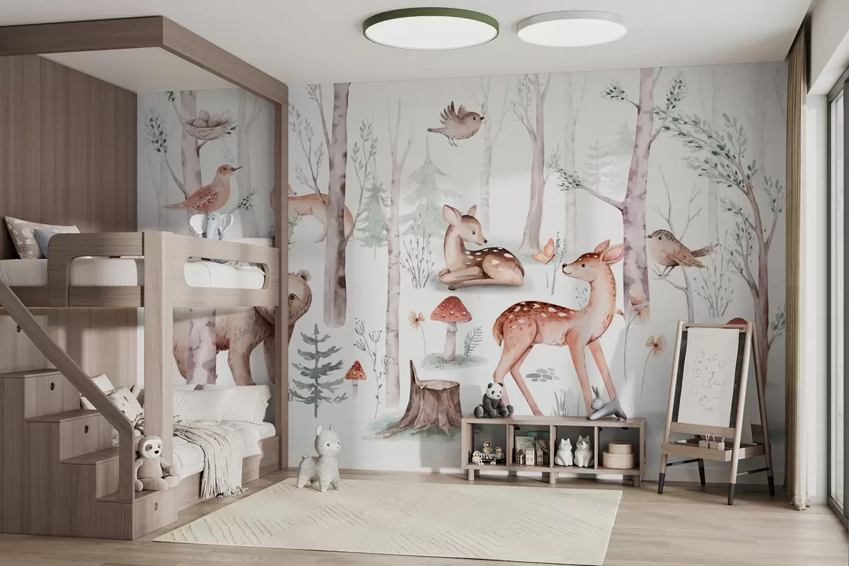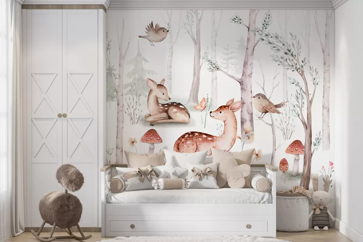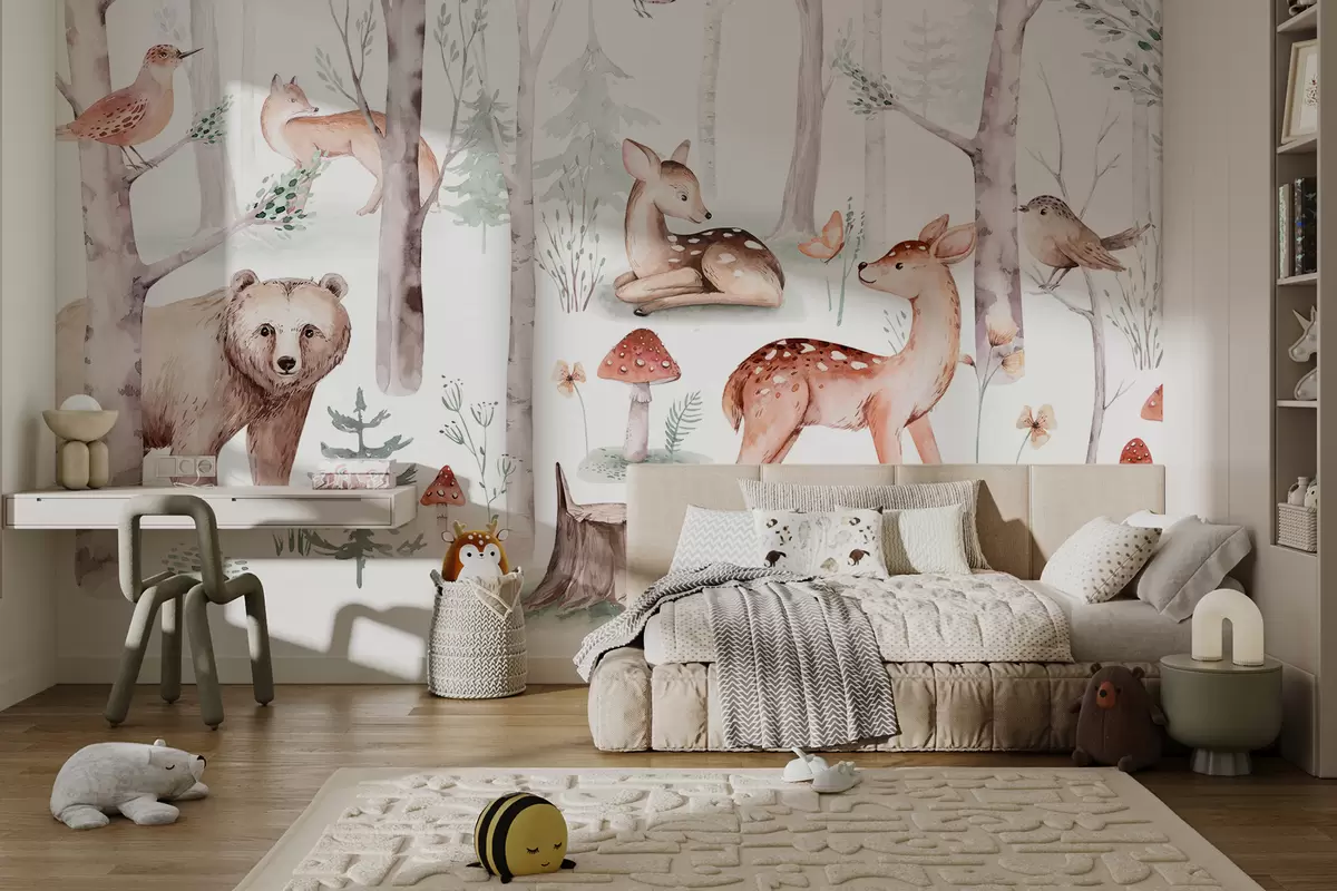 Papel tapiz Papel pintado para la habitación de los niños, animales del bosque. Delicado papel pintado de estilo acuarela en agradables colores pastel cálidos sobre fondo blanco Nr. w01089