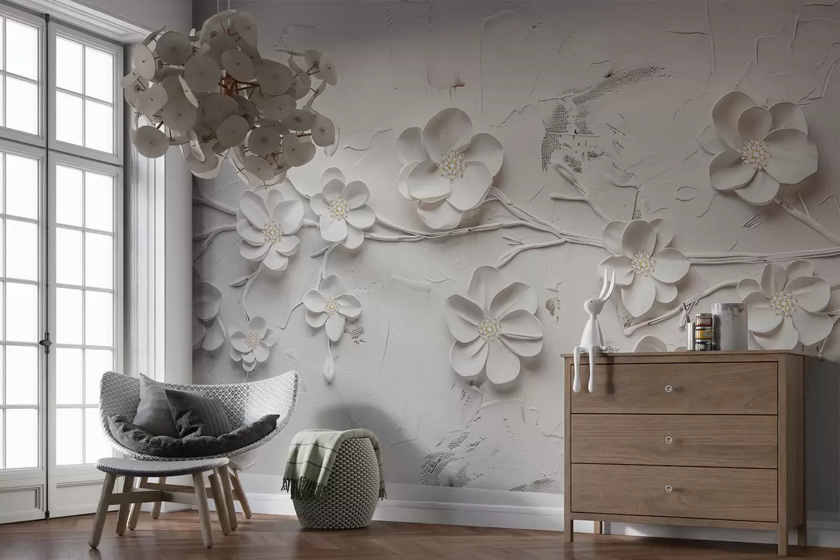 Papel tapiz Fondo blanco texturizado con flores blancas 3D en plena floración, conectadas por ramas, minimalistas y elegantes Nr. w01226