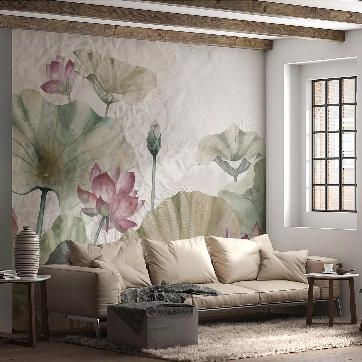 Papel tapiz Flores de loto rosa con hojas verdes sobre un fondo de textura clara Nr. w01248