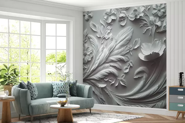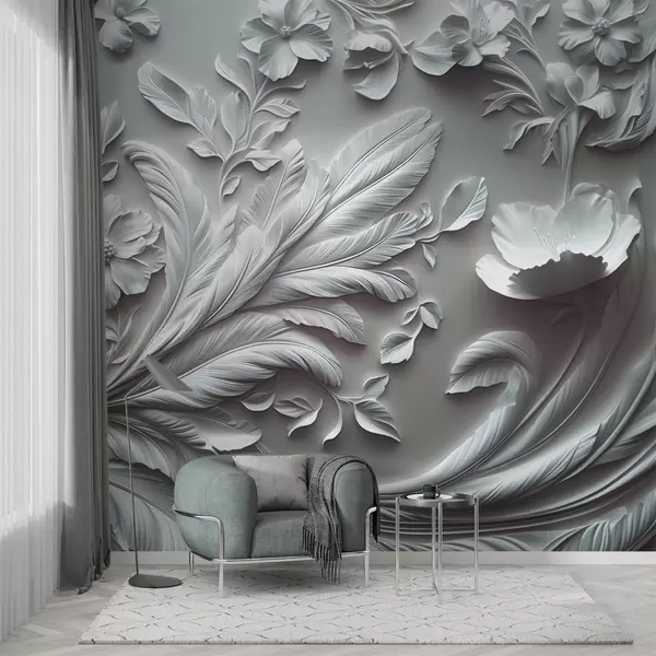 Papel tapiz Exquisitas flores y hojas en relieve en tonos grises Nr. w01356v2