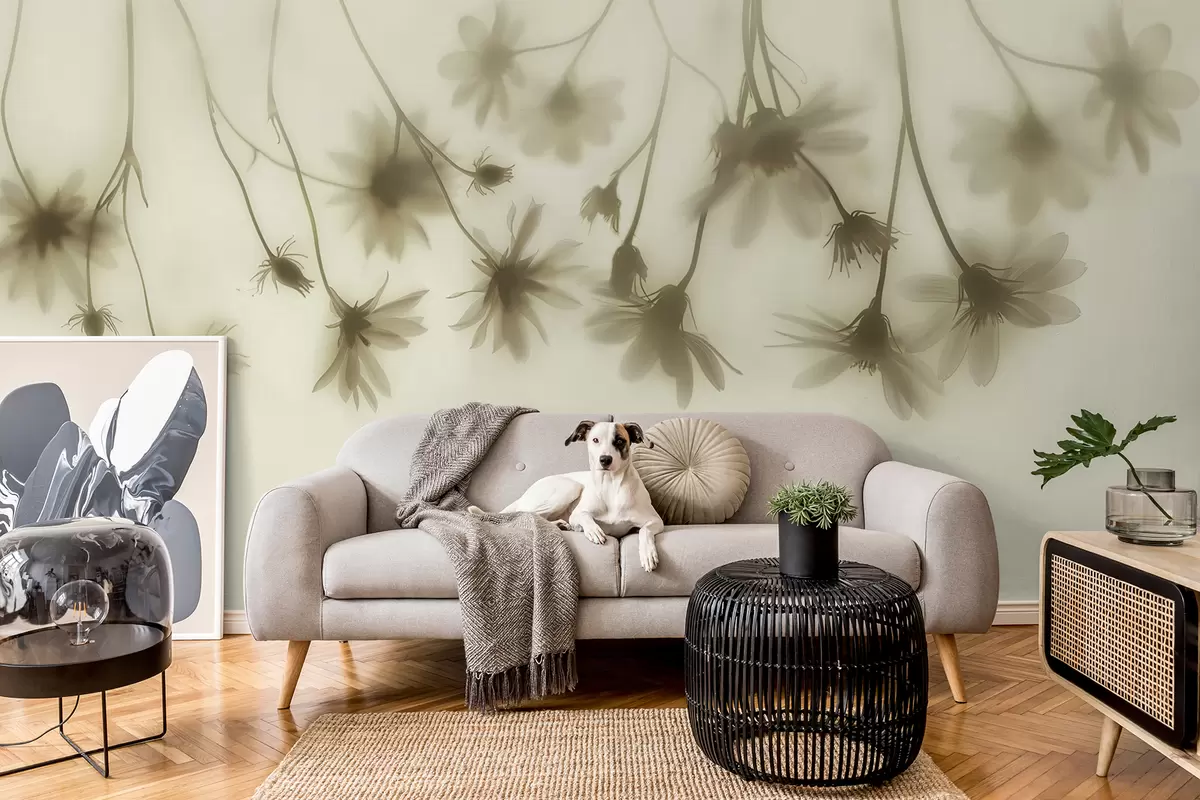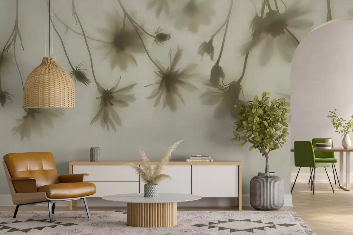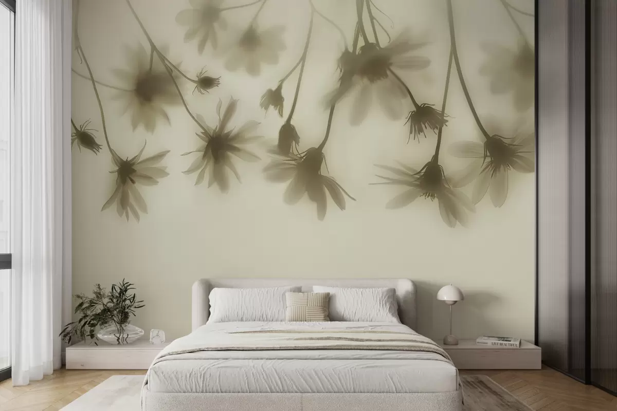 Papel tapiz Delicadas flores en la niebla colgando desde arriba en colores pastel. Nr. w01469v1