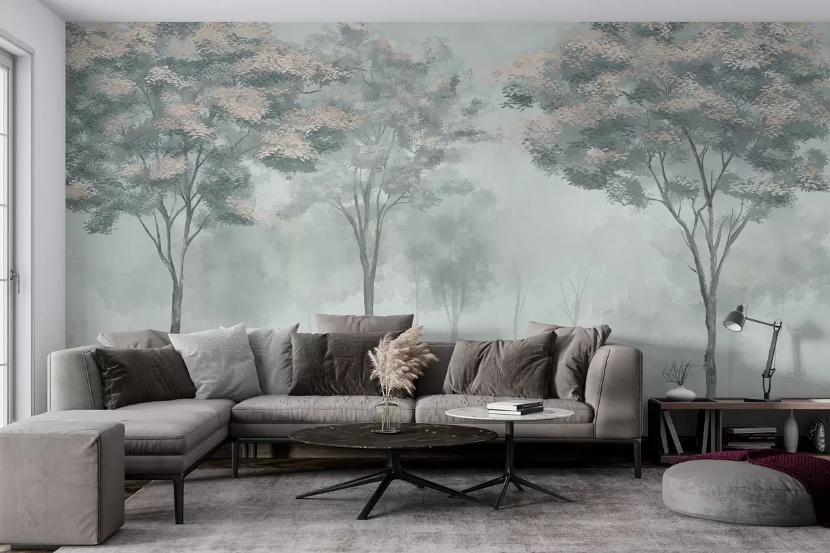 Papel tapiz Silueta de bosque brumoso en colores verde, gris claro y beige Nr. w01599