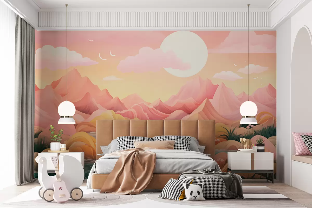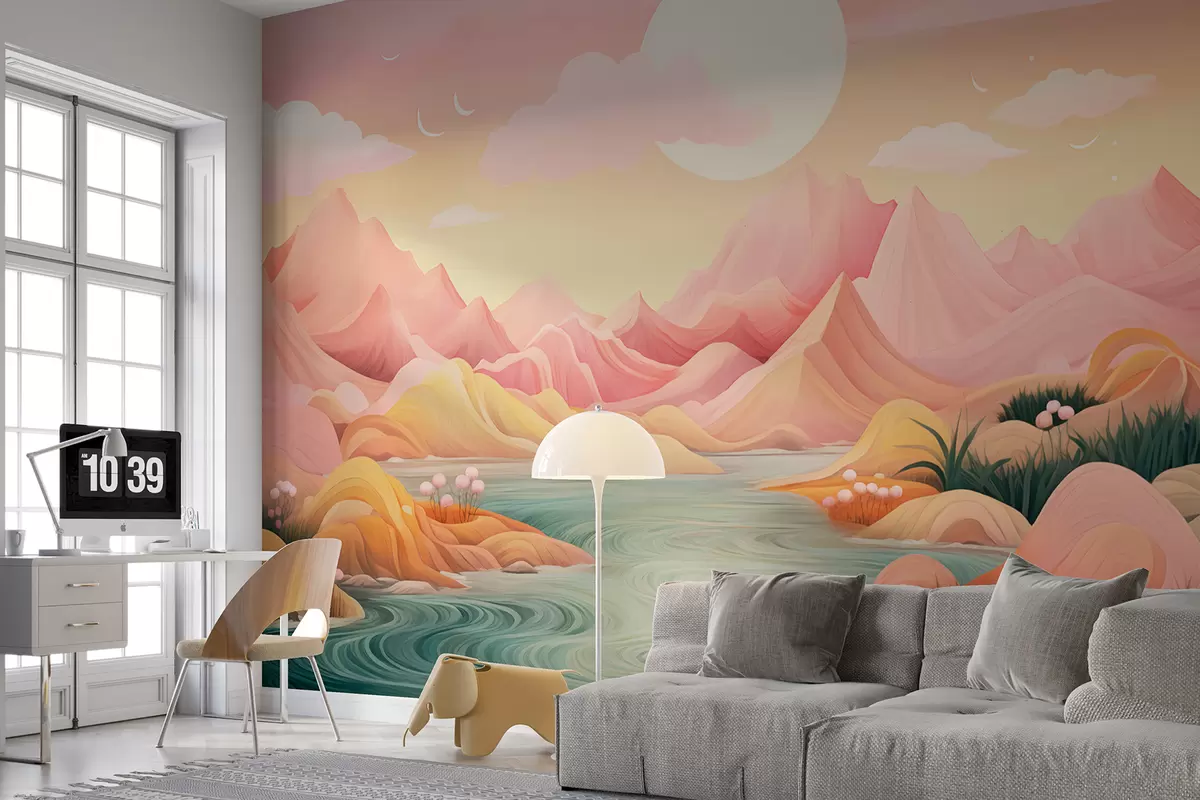 Papel tapiz Fantástico paisaje de colores pastel con suaves montañas rosas y melocotón Nr. w01656