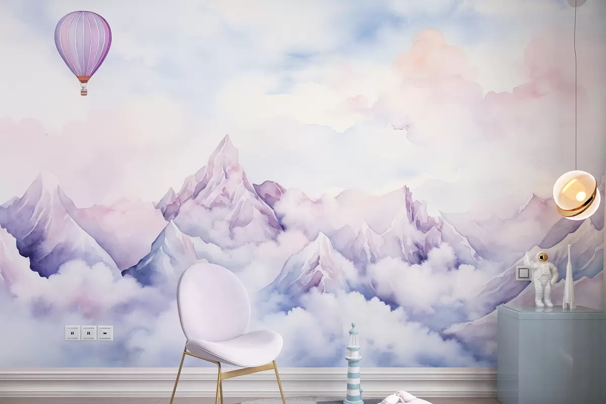 Papel tapiz Globo de aire en las montañas, acuarela, suaves colores etéreos Nr. w01789