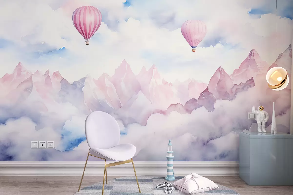 Papel tapiz Hermoso paisaje de montañas con globos de aire, acuarela Nr. w01792
